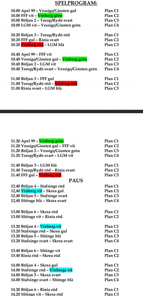 Hej. Spelschemat på lördag: • Kl. 12.15 Böljan - Vinberg Plan D1 • Kl. 13.45 Vinberg - Apel Plan D1 // Tränarna