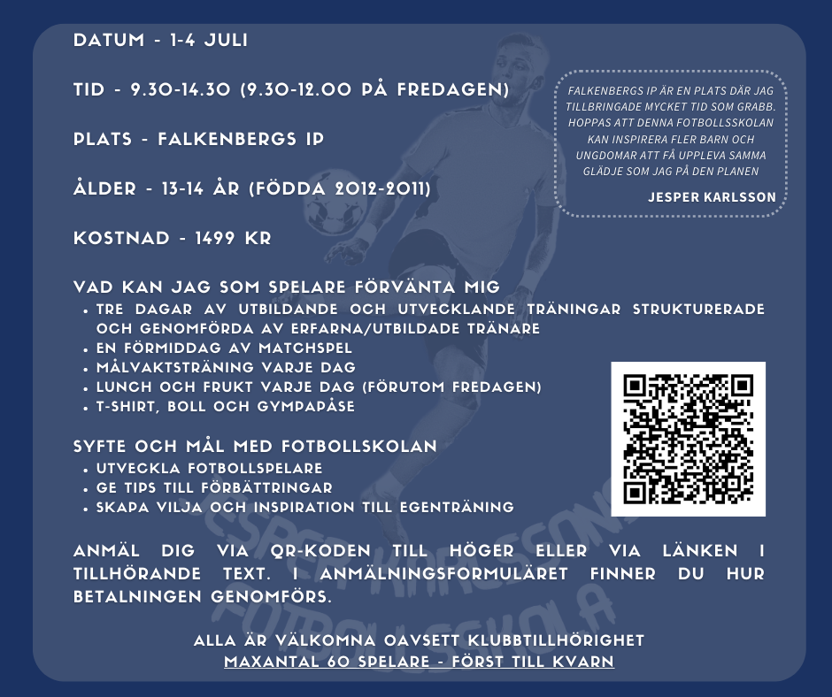 Hej! Vilken härlig torsdag vi fick tillsammans med spelarna och en rolig men kall dag idag. Bifogar information från Böljans fotbollsskola och påminner om Vinbergs fotbollsskola i sommar. Vinbergs fobollsskola: Datum16-18/6 Kl 10-14 Anmälan senast 6/6 till vinbergsif@hotmail.com 500kr för medlem Om ni redan nu vet datum då era barn inte kan spela matcher så får ni gärna meddela oss det. Lättare att planera då. Hälsningar tränarna.